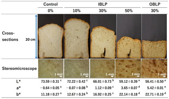 Cross-sectional observations under a stereomicroscope revealed that the crumb structure of the breads in the control and 10% IBLP replacement groups were finer, characterized by smaller and more uniform bubbles with thinner dough surrounding them. In contrast, the breads in the 30% and 50% IBLP and 30% OBLP replacement groups had an increased number of larger bubbles and a thicker dough around the bubbles.