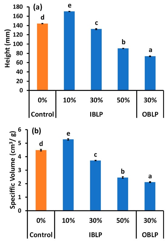 The height and specific volume of the bread samples differed significantly (p < 0.05) among all groups (Figure 4a,b). The highest height was observed in the IBLP 10% replacement group (17.00 cm), followed by the control (14.40 cm), IBLP 30% replacement (13.20 cm), IBLP 50% replacement (9.00 cm), and OBLP 30% replacement (7.30 cm) groups (Figure 4a).