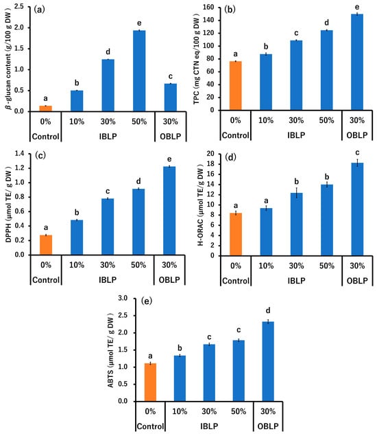 Effect of different mixing proportions of waxy barley bran on β-glucan content (a), TPC (b), DPPH (c), H-ORAC (d), and ABTS (e). Bars represent the mean ± standard error (n = 8 for β-glucan, n = 6 for TPC, DPPH, and ABTS, n = 4 for H-ORAC). Different letters (a–e) indicate significant differences (p < 0.05). IBLP—inner bran layer powder; OBLP—outer bran layer powder; TPC—total polyphenol content; CTN eq—catechin equivalent; TE—Trolox equivalent; DW—dry weight.