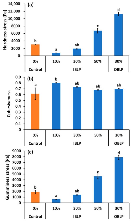 Effect of waxy barley bran on hardness stress (a), cohesiveness (b), and gumminess stress (c) of bread after baking. Bars represent the mean ± standard error (n = 10). Different letters (a–d) indicate significant differences (p < 0.05). IBLP—inner bran layer powder; OBLP—outer bran layer powder.