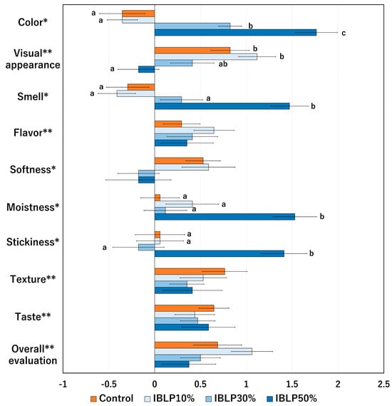 In a preliminary experiment, OBLP-substituted bread exhibited an unfavorable taste. Therefore, sensory evaluation was performed on four types of samples: control and IBLP replacement groups (10%, 30%, and 50%). The samples were cooled for 24 h post-baking and cut into pieces measuring 5 × 4 × 1 cm. These pieces were provided to 17 non-sensory training panelists, including both male and female students and faculty members from Tottori College. The evaluation criteria used were based on Kinner et al. (2011) [24] with some modifications. Namely, panelists evaluated the samples for color, flavor, softness, stickiness, and moistness as identification tests. The visual appearance, flavor, taste, texture, and overall acceptability were evaluated as taste tests; both tests were scored using a 5-point scale from −2 (weak and undesirable characteristics) to +2 (strong and desirable characteristics). Water was offered as a palate cleanser between samples. This study was approved by the Ethical Review Committee for Research Involving Human Subjects at the Faculty of Human Sciences of Shimane University (Approval No.: 2023-11).