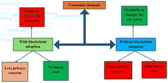 Figure 1 shows how consumer behavior is affected by the adoption of blockchain technology. With a blockchain platform, consumers can be attracted by two main features, such as no hassle cost and less privacy concern. The hassle cost is the cost of the effort, time, frustration, or complexity that a person has to endure. In this case, the consumer has to pay for gathering information about the authenticity and possible contamination of the food item which is to be purchased. Also, with blockchain adoption, consumers will be less concerned about any transaction privacy regarding funds or information. However, a platform charge must be incurred at both party’s (retailer or manufacturer) ends.