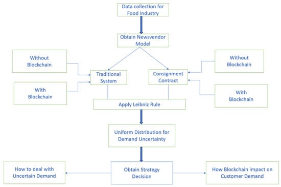 Figure 2 describes the theoretical process flow and methods. The process starts with collection of data and information from the food industry. Then, the newsvendor model is created to optimize the decision variables. The model is developed for both traditional and consignment contracts and in both models, two separate cases are considered, namely, with the blockchain model (Model BC) and without the blockchain model (Model WBC). To solve the proposed models, we use the Leibniz rule as we need to obtain the differentiation under the sign of integration. In calculus, differentiation under the integral sign is a method for evaluating specific integrals. Differentiation under the integral sign permits one to switch the sequence of differentiation and integration under relatively liberal requirements for the function being integrated. The following equation is valid with minimal assumptions in its most basic form, known as the Leibniz integral rule, which is differentiation under the integral sign: