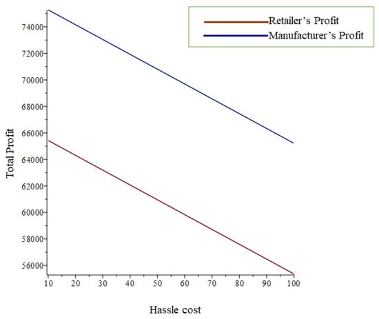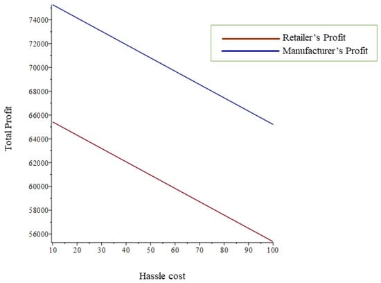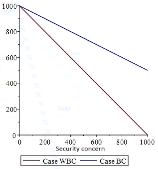 With blockchain, customers may encounter fewer privacy concerns as a decentralized system is used. Thus, we consider , which reflects that the demand affected by the privacy concern in the WBC model is much less than the amount of demand influenced by the BC model. Evidently, the hassle cost is nullified in the BC model. The demand function in BC is as follows: