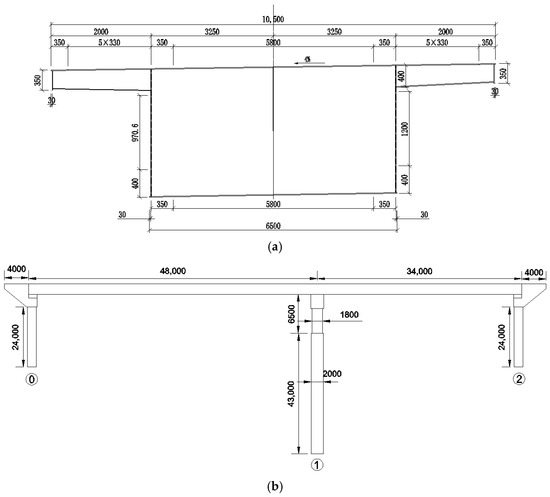 Bridge layout: (a) standard cross-sectional drawing; (b) profile of the bridge (unit: mm).