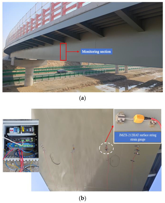 Analyzing the collected data can reveal the location and number of vulnerable points in the bridge structure. Based on the relevant regulations of the highway bridge load test specifications [18] and the actual situation at the site, the mid-span of the second span was selected as the monitoring section, and sensors were arranged in this section. The location of the monitoring section is shown in Figure 3a.