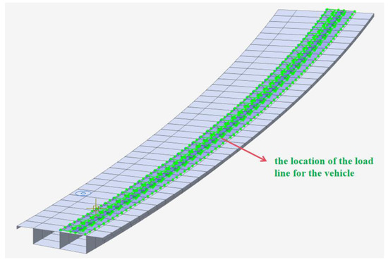 The main girder was simulated using beam elements, with 63 elements. The material parameters were determined according to the design drawings, and Q355qE steel was adopted for the main structures, such as the top and bottom plates, webs, diaphragms, stiffeners, and other components of the steel box girder. The top joint of the support was rigidly connected to the main beam joint, the bottom joint of the support was fixedly connected, and an elastic connection was adopted between the top and bottom of the support. The stress analysis of this model was divided into stress conditions under a dead load, live load, temperature load, and combined loads. This paper considered the self-weight and the second-stage dead load to analyze the dead load. The moving vehicle load was simulated using the lane load, with two lanes loaded according to the actual bridge conditions. The temperature load included the overall temperature increase and overall temperature decrease. The self-weight and secondary loads were converted to node masses and the deck pavement, guardrails, and other deck system components were approximated as linear loads for loading without participating in the structural forces. The vehicle loads were arranged according to the specifications for highway bridges. The parameters obtained from the finite element model calculations, such as the mid-span deflection, strain, vibration frequency, and vibration time history of the bridge segment, were used as theoretical values. A comparative analysis was conducted with the measured values from field tests to evaluate the dynamic performance of the tested bridge.