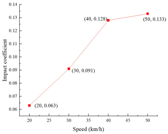 The vehicle’s speed was varied, with a fixed curvature radius of 270 m and a vehicle weight of 15 tons. Under excitation from vehicle speeds of 20 km/h, 30 km/h, 40 km/h, and 50 km/h, dynamic strain data were collected from the bottom of the monitored cross-section of the bridge structure. Using the formula above, the impact coefficient was calculated. The impact coefficients under excitation from different vehicle speeds are shown in Figure 8.