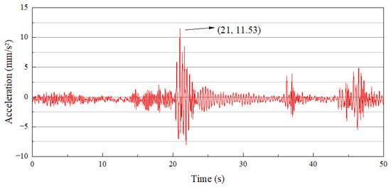 During this test, a loaded truck (15 tons) was used to conduct a hop test with its rear wheels at the midpoint of the second span. The test method involved the test vehicle jumping over a 10 cm high bumper plate and performing a vertical vibration assignment analysis and a vibration response analysis on the measurement points. The measured vibration response at the measurement point at the midpoint of the second span during the hop test with the test vehicle’s rear wheels is shown in Figure 10.