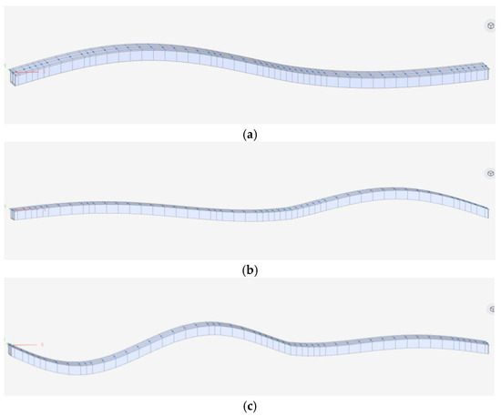 A structural dynamic analysis was conducted using the MIDAS CIVIL NX finite element analysis software, and the structure’s vibration frequencies and modes were obtained. The calculated results for the bridge’s first three natural frequencies are shown in Figure 12.