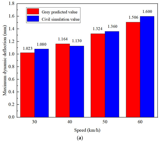 Considering the speed limit on the ramp, the maximum dynamic deflection, maximum dynamic strain, and vibration acceleration at the monitoring section were predicted using a grey prediction model when the vehicle speed ranged from 20 to 60 km/h. Subsequently, finite element software was utilized to simulate the maximum dynamic deflection, maximum dynamic strain, and vibration acceleration at the mid-span measurement point as a loaded vehicle passed through at 30 to 60 km/h speeds. The difference between the grey prediction and finite element simulation values was relatively small, indicating a good prediction result.