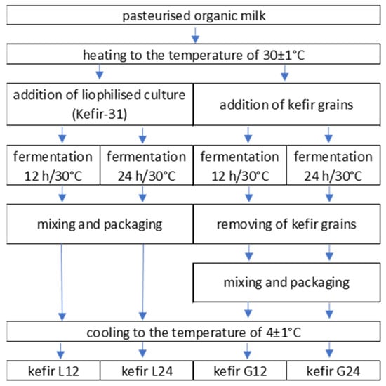 For kefir fermentation, a traditional culture in the form of kefir grains (KG) (Serowar, Szczecin, Poland) and a freeze-dried (lyophilized) culture, Kefir-31 (Biochem s.r.l., Rome, Italy) intended for direct inoculation of processed milk were used. The freeze-dried culture contained the following microorganisms: Lactococcus lactis subsp. cremoris, Lactococcus lactis subsp. lactis biovar diacetylactis, Leuconostoc mesenteroides subsp. cremoris, Lactobacillus delbrueckii subsp. bulgaricus, and Saccharomyces cerevisiae. The culture in the form of KGs was added in the amount of 20 g/1 L of milk [31,45,46,47], while the freeze-dried culture was added at a rate of 0.1 g per 1 L, according to the manufacturer’s recommendations. Kefir fermentation was carried out at 30 °C, which is within the optimum temperature range for the freeze-dried culture and can also be used in the production of kefir using the traditional KGs [33,47]. The kefirs were produced using the tank method. The procedure of kefir production is shown in Figure 1.