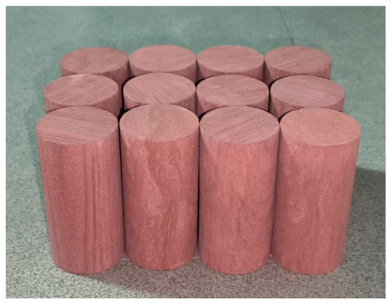 The primary minerals of this type of rock are quartz and feldspar, characterized by a brown color and argillaceous-calcite cementation. Using an automatic coring machine, an automatic rock cutting machine, and a double-sided grinding machine, the borehole cores are processed into standard cylindrical specimens (Φ50 mm × 100 mm) through coring, cutting, coarse grinding, and fine grinding. The flatness error of the specimen end faces is no greater than 0.05 mm, and the height, diameter, or side length error of the specimen is no greater than 0.3 mm, as shown in Figure 2.