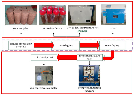 (1) Soaking Test: To simulate shallow groundwater quality, dilute hydrochloric acid with a pH value of 5.0 was used as the acidic solution. Plastic bottles were utilized as individual containers, each with the same solution volume, and only one rock sample per bottle. The temperature test chamber used was a DW-40 low-temperature test chamber, capable of adjusting temperatures within the range of −55 °C to 80 °C. Based on the geological environment of the area, the test chamber was set to water temperatures of 5 °C, 15 °C, 25 °C, and 35 °C. The plastic bottles containing the rock samples were placed in the low-temperature test chamber and soaked for durations of 1 day, 3 days, 7 days, and 14 days. Before testing, the specimens were dried in an oven at 105 °C for 12 h and subsequently oven-dried at 105 °C for 24 h post-immersion; this was defined as one immersion cycle.