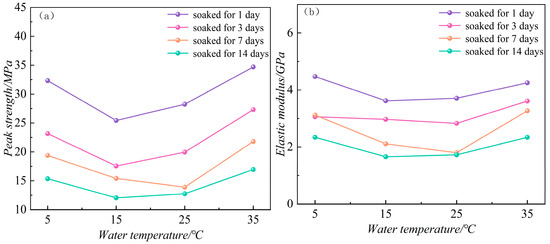 Figure 4 presents the trends in the peak strength and elastic modulus of argillaceous siltstone as a function of water temperature, highlighting distinctive concave curves that clearly illustrate the relationships between temperature and these mechanical properties. As the water temperature increases, both the peak strength and elastic modulus initially decrease, followed by a subsequent increase. Notably, under extreme temperature conditions, specifically at 5 and 35 °C, the peak strength and elastic modulus are significantly higher than at intermediate temperatures of 15 and 25 °C. Additionally, with an extended soaking duration, the temperature’s effect on the peak strength and elastic modulus becomes less pronounced. During the initial soaking period (1–3 days), the impact of water temperature on the peak strength and elastic modulus of argillaceous siltstone is very significant. However, as the soaking duration increases, the influence of water temperature on the peak strength and elastic modulus of argillaceous siltstone diminishes.