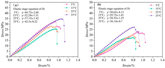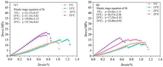 In the early stages of immersion (1–3 days), the stress–strain curve displays four distinct phases: the microcrack compaction phase, elastic deformation phase, plastic yielding phase, and strain-softening phase. During this period, the increase in internal microcracks due to hydration is especially pronounced, highlighting a plastic yielding phase that is absent under natural conditions. Here, the influence of water temperature on the stress–strain curve remains negligible.