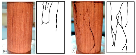 The process of microcrack initiation, propagation, and coalescence into macroscopic fractures is the reason for the progressive damage and eventual instability failure of rock specimens. The types of microcracks and macroscopic fractures help reveal the mechanical mechanisms of rock specimen instability and failure under different water temperatures. Based on the failure mechanism, macroscopic fracture types in rocks can be categorized into tensile cracks and shear cracks. Tensile cracks initiate and propagate from the crack tips, extending linearly toward both ends of the rock specimen. If this process continues along an inclined curve, it forms shear cracks. To understand the failure characteristics of argillaceous siltstone in different water temperature solutions, a failure characteristic analysis was conducted on the specimens after failure. As shown in Figure 6, argillaceous siltstone subjected to different water temperatures under uniaxial compression produced more than one obvious failure crack, and the failure surfaces were rough. At water temperatures of 5 °C and 35 °C, the failure mode of argillaceous siltstone was mainly tensile failure, with tensile cracks generated under axial stress that did not penetrate the entire specimen, maintaining a relatively intact state. At water temperatures of 15 °C and 25 °C, the failure mode was primarily “X”-shaped shear failure, with a significant increase in the number of tensile cracks accompanied by the appearance of shear cracks. The tensile cracks initiated and propagated from the crack tips, extending linearly towards both ends of the rock specimen. Eventually, the cracks interconnected, causing severe local damage or even spalling of the rock mass, resulting in a relatively fragmented state of the specimen.