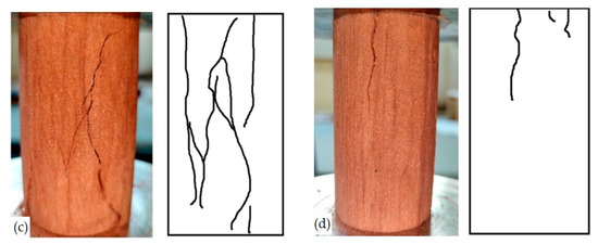 Failure modes of argillaceous siltstone under different water temperatures: (a) 5 °C. (b) 15 °C. (c) 25 °C. (d) 35 °C.