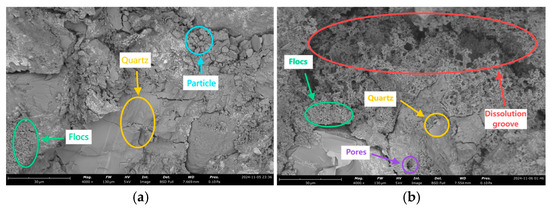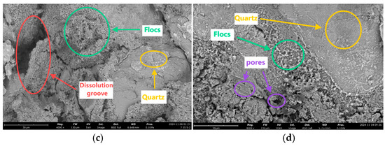 Figure 5a–d show the microstructures of argillaceous siltstone under water temperatures of 5 °C, 15 °C, 25 °C, and 35 °C, respectively. At 5 °C, parts of the quartz structure have been damaged, and a small amount of flocculent bodies and fine particles appear. These flocculent bodies typically manifest as micron- to millimeter-sized aggregates. As the temperature increases to 15 °C, the degree of damage to the quartz structure further intensifies, forming a large number of flocculent bodies, most of which have been damaged and form corrosion grooves. At 25 °C, the quartz structure shows signs of fracturing, the number of flocculent bodies decreases, and the corrosion grooves become shallower and narrower. At 35 °C, the quartz structure is relatively intact, the flocculent bodies significantly decrease, and their structure shows no evident signs of damage. Due to the significant changes in the internal structure of argillaceous siltstone under different water temperatures, the impact of water temperature on the strength and elastic modulus of argillaceous siltstone becomes very pronounced.