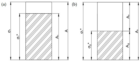 In the field of damage mechanics, it is commonly assumed that the material is isotropic. According to Lemaitre’s strain equivalence hypothesis, the material’s damage can be defined by its effective load-bearing area. Therefore, a micro-element analysis of the argillaceous siltstone at different stages was performed. Let us assume that the micro-element area and nominal stress in the undamaged state are A and σ1, respectively. After cyclic temperature exposure, the effective area and stress become A1 and σ1*, while following additional damage from loading under the influence of water temperature, they are denoted as A2 and σ1 (see Figure 8).