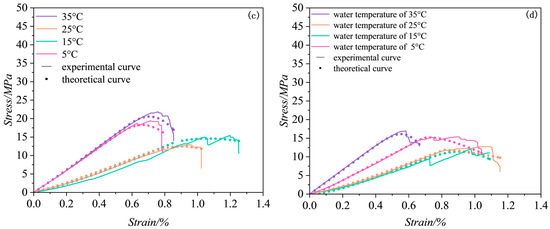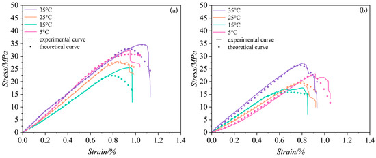 By substituting the constitutive model parameters obtained into Equations (19) and (20), the theoretical stress–strain curve for argillaceous siltstone under different water temperature effects can be derived, as shown in Figure 9. It can be observed that the theoretical curves of the constitutive model align closely with the experimental curves, accurately reflecting the deformation characteristics of argillaceous siltstone.