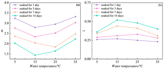 The parameter λ lambda represents the scale parameter in the Weibull distribution function, which determines the scale or range of the distribution. In a physical sense, it can, to some extent, reflect the plastic characteristics of the rock. The shape parameter mm indicates the degree of material homogeneity, where a higher m value suggests greater homogeneity in the mechanical properties of the rock, while a lower m value indicates lesser homogeneity [30]. As shown in Figure 10, When the water temperature is between 5 °C and 15 °C, the shape parameter m decreases with rising water temperature, leading to a decrease in strength. Conversely, between 15 °C and 35 °C, the shape parameter m increases with rising water temperature, resulting in an increase in strength. The trend of the scale parameter λ with increasing water temperature is opposite to that of the shape parameter m. When the water temperature is near room temperature (15–25 °C), the scale parameter λ increases, indicating that the plastic characteristics of argillaceous siltstone become more pronounced. Between 5 °C and 15 °C, as the water temperature rises, the scale parameter λ increases. However, between 15 °C and 35 °C, as the water temperature rises, the scale parameter λ decreases, indicating a reduction in the plastic characteristics of argillaceous siltstone.