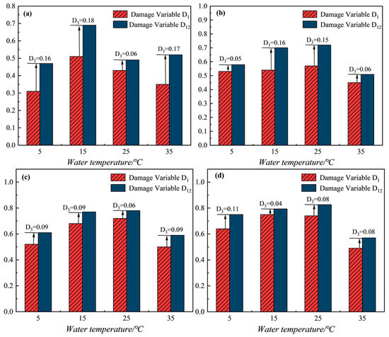 The effect of water temperature compromises the internal structure of argillaceous siltstone, which is macroscopically reflected as decreases in peak stress, elastic modulus, and related parameters. The elastic modulus, as a representation of the rock’s deformation capacity, more effectively captures the extent of damage in argillaceous siltstone. Consequently, the damage variable D1 induced by water temperature can be defined using the elastic modulus as follows: