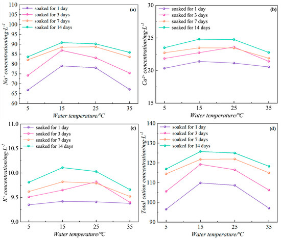 During the soaking process at different water temperatures, chemical reactions between the minerals in argillaceous siltstone and water lead to changes in cations (such as Na+ and Ca2+). These reactions involve the hydrolysis of minerals with water. Additionally, during hydration, the minerals in argillaceous siltstone absorb water, swell, and adsorb various ions. The release and migration of these ions reduce the rock’s cohesion and shear strength, leading to a decline in the overall mechanical properties of the soft rock, which makes it more prone to softening and even disintegration. To gain a deeper understanding of the mechanisms of water–rock microchemical interactions influenced by water temperature, it is essential to investigate the changes in cation concentrations in argillaceous siltstone during soaking at different water temperatures.