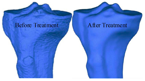 The 3D model of the human tibia was constructed using the aforementioned method, which resulted in the formation of surface defects and an overall model that was relatively complex. Therefore, the model was first converted into a point cloud model. Then, the Geomagic Studio 2015 software was used for surface reconstruction, repairing surface defects, and streamlining the model. The first step in the surface reconstruction was point cloud simplification, which involved using a unified sampling method to reduce the number of point clouds in the model with an absolute sampling spacing of 0.48 mm. Second, the simplified point cloud model needed to be converted into a polygon model before being encapsulated with a maximum of 30 triangles during encapsulation. Mesh redrawing and noise reduction treatments were required because of the presence of surface imperfections, such as holes and nails, with the packaged model. This required setting target edge length to 0.8 mm, smoothness level to 3, smoothness to 70, and deviation limit to 1 mm. The models before and after polygon repair are shown in Figure 2.