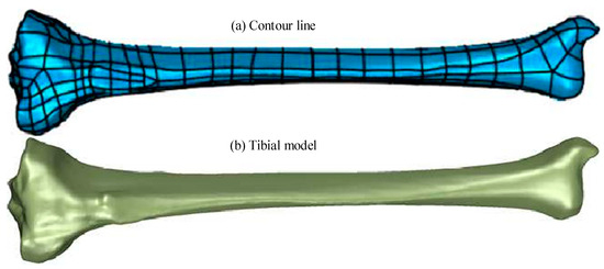 As shown in Figure 2, after polygon processing, the surface of the model was relatively smooth, without obvious defects such as holes or nails. This model was used as a basis to perform surface fitting on the tibial model. The selected surface was a NURBS surface, and the contour lines were manually drawn when performing surface fitting. Then, a surface patch (with 30 grids) was constructed based on the contour lines. Adaptive fitting considering the irregular shape of the surface patches was required to ensure the accuracy of the model. When fitting, the control point should not exceed 18 and the surface tension should be 0.3. Compared to models obtained through specialized software, the tibial 3D model obtained through the above method had good dimensional and structural universality. The axial functional gradient model could effectively avoid boundary abnormal stresses caused by discontinuous material properties, allowing the material properties of the model to continuously and smoothly change. Thus, finite element simulation results that were closer to the actual situation could be obtained. The hand-drawn contour lines and fitted tibial model are shown in Figure 3.