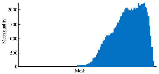 After constructing the 3D model of the human tibia using the above-described methods, an FEM of the tibia based on this 3D model was built. The Three-matic 8.0 software was used to locally refine and optimize the mesh of the model to ensure its accuracy and simulation effectiveness when constructing the FEM. Compared to other software, Three-matic has the ability to highly automate the design modification, FEA/CFD pre-processing, and mold design of STL files while also enabling design modifications for complex free-form surfaces. The mesh was homogenized to ensure the accuracy and reliability of the simulation. The number of triangular meshes on the surface of the model was minimized as much as possible while retaining accuracy to reduce the size of the model. Through the above operation, high-quality surface meshes were obtained with a mesh count of 66,780. For body meshes, traditional hexahedral elements could increase simulation accuracy, but generating hexahedral elements was prone to errors due to the irregular shape of the tibia. Using the appropriate tetrahedral elements could effectively ensure simulation accuracy during biomechanical analysis [13]. Therefore, tet 10 elements were used as the body mesh of the model, with a maximum side length of 3 mm. The tet 10 elements had appropriate plasticity and creep as well as a large strain capacity. Each node had three degrees of freedom in the X, Y, and Z directions. The mesh quality distribution of the tibial model is shown in Figure 4.