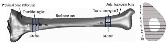 is the apparent density, is the grayscale value, and is the YoM. Due to the varying degrees of calcification in different tibial regions, materials in the transition zone are used as functional grading materials to accurately simulate the mechanical properties of the tibia. The volume fraction of each region of the tibia is given in Equation (7).