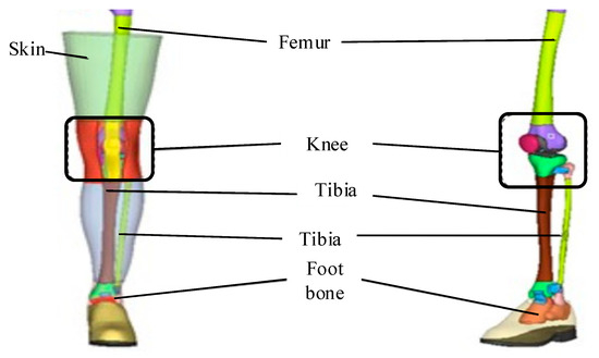 As shown in Figure 6, during the modeling process, the lower limb surface skin was used as the outer boundary, and the lower limb femur surface was used as the inner boundary. High-quality hexahedral elements were also selected to mesh the lower limb muscle model, and a 2.5 mm-thick shell element was generated on the surface of the muscle mesh model using the faces function as the skin. The muscles and bones in the model were connected using a common node method, and the skin and muscles were also connected using a common node method. The final finite element models of the thigh and calf muscles were obtained. The focus of model development is on the long bones and knee joints of the lower limbs. By importing the established finite element models of various tissue structures of the lower limbs into finite element pre-processing software for assembly and connection adjustment, a standard 50 percentile Chinese adult male standing posture lower limb biomechanical finite element model with complete structure can be obtained.