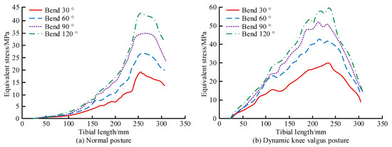 Figure 7a shows that under normal posture, as the tibia lengthened, the equivalent force first increased and then decreased, reaching a maximum at 250 mm. The curve before the peak was approximately a quadratic curve. In addition, the growth rate of the equivalent stress substantially accelerated as the bending angle increased. For the four different flexion angles, the stress concentration with the normal posture mainly occurred in the anterior part of the middle and lower tibia. The peak stress roughly occurred at the junction of the middle and lower third of the tibia. Figure 7b shows that under the DKVPs, the equivalent force also first increased and then decreased, reaching a maximum at 250 mm, as the length of the tibia increased. Unlike for normal posture, the curve before the peak is close to linear. The growth rate of the equivalent force also considerably accelerated as the bending angle increased. The stress concentration in the DKVP group mainly occurred on the inner side of the middle tibia, roughly distributed along the inner edge, gradually decreasing from the middle of the tibia to both ends. The reason for this is the imbalance in the torque between the internal and external extensor muscles of the hip, which causes abnormal lateral force on the tibia. The maximum equivalent stress (MES) of the tibia and its plateau in the different poses is shown in Figure 8.
