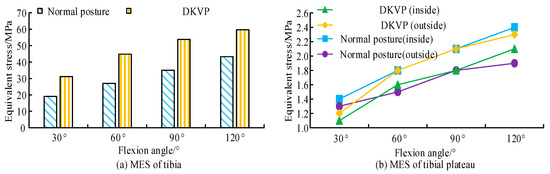 As shown in Figure 8a, the MES in the DKVPs was larger than that in the normal pose under the same flexion angle. For 30° and 90° flexion, the MES in the normal posture and DKVPs were 19.1 MPa/35.0 MPa and 31.2 MPa/53.8 MPa, respectively. During bending from 30° and 90° to 120°, the MES increased 29%, 22.69%, and 19.23%, respectively. Figure 8b shows that the equivalent stress of the medial tibial plateau (MTP) in the normal posture was higher than that on the lateral side, whereas the equivalent stress in the DKVPs was less than that on the lateral side. For 30° flexion, the equivalent stresses of the medial and lateral tibial plateaus in normal posture were 1.4 MPa and 1.8 MPa, respectively. Those of the DKVPs were 1.1 MPa and 1.2 MPa, respectively. The MES in the DKVPs was higher by 38.8%, 39.65%, 34.95%, and 27.52% compared with that in the normal posture group at the four different flexion angles. Dynamic knee flexion was more likely to cause substantial tibial damage due to the middle tibia having a smaller cross-sectional area than the mid-lower tibia.