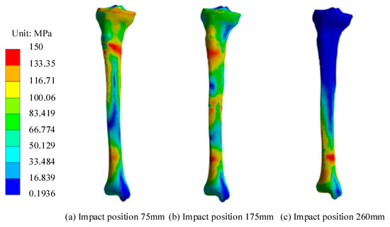 Equivalent force cloud map of tibia for different impact positions. (a) Impact position 75 mm. (b) Impact position 175 mm. (c) Impact position 260 mm.