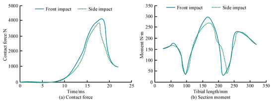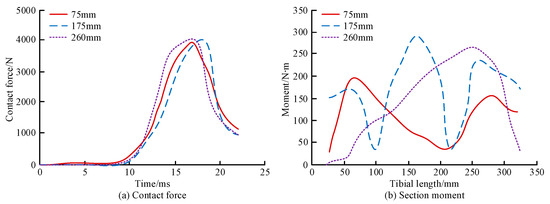 As shown Figure 10a, the contact force first increased and then decreased over time after impacts at different positions of the tibia, reaching a peak between 15 and 20 ms. The maximum contact forces of q were 3927 N, 4000 N, and 4083 N when the tibia q was impacted at 75 mm, 175 mm, and 260 mm, respectively. The maximum contact force values at three different impact positions were similar. However, the maximum contact force appeared later during mid-section impact than in the other two groups. As shown in Figure 10b, when the tibia impacts 75 mm and 175 mm, the CSM fluctuated along the length of the tibia, with peak moments of 192 N∙m and 289 N∙m, respectively. With a 260 mm impact, the tibial CSM first increased and then decreased, with a peak moment of 272 N∙m. All three impacts exhibited the largest sectional moments on the cross-section near the impact location, and the sectional bending moment of the middle impact was larger than that of the other two impacts. Figure 11 shows the contact force and CSM of the tibia for the different impact directions.