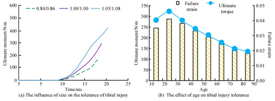 As shown in Figure 12a, the ultimate torque also increased as the size of the tibia increased. The ultimate moments of the tibia with scaling ratios of 0.84/0.86, 1.00/1.00, and 1.05/1.08 were 168 N∙m, 297 N∙m, and 420 N∙m, respectively. Figure 12b shows the ultimate moment and failure strain of the tibia both increase first and then decrease with age. The maximum ultimate torque and failure strain occurred at the age of 25 years, at 323 N∙m and 0.041, respectively.