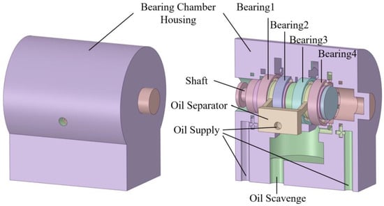 The geometric model of the bearing chamber–bearing system employed in this article consists of four ball bearings, sequentially numbered 1, 2, 3, and 4 from left to right along the axial direction, as depicted in Figure 1. The structural parameters for these four ball bearings are identical, as specified in detail in Table 1. The system is equipped with three distinct oil supply paths. Lubricating oil is delivered to the left and right annular cavities via two supply routes located at the bottom of the system. Each annular cavity is fitted with two oil injection nozzles, which provide jet lubrication to Bearings 1 and 4, respectively. The oil supply path on the side of the system diverts the lubricating oil into an oil separator, which divides the oil into two streams. One of these streams individually lubricates Bearings 1 and 2 through two injection nozzles that face opposite directions. Similarly, the other stream is directed to lubricate Bearings 3 and 4.