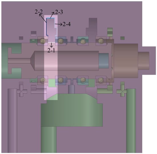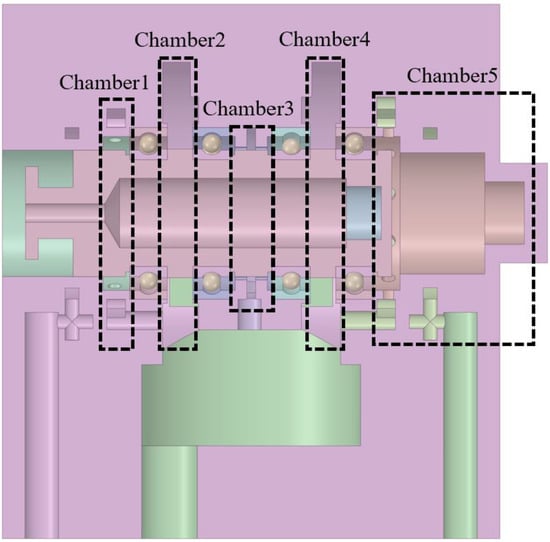 The overall structure of the bearing chamber–bearing system is intricate, comprising five distinct bearing chambers, as illustrated in Figure 2. To effectively decouple the calculation of the oil–air two-phase flow within the bearing chamber from the temperature field analysis of the entire bearing chamber–bearing system, this article adopts a strategy that involves analyzing the oil–air two-phase flow and heat transfer process within each individual bearing chamber separately. By doing so, the convective heat transfer coefficients associated with the chamber walls are determined and used as thermal boundary conditions for the subsequent steady-state temperature field analysis of the entire system. This approach allows for a more focused and manageable analysis of the complex interactions occurring within each chamber, which is crucial for accurately predicting the thermal behavior of the system as a whole.