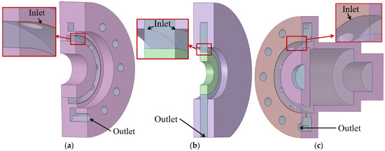 Geometric model of bearing chamber. (a) Structure of Chamber 1; (b) structure of Chamber 2; (c) structure of Chamber 5.