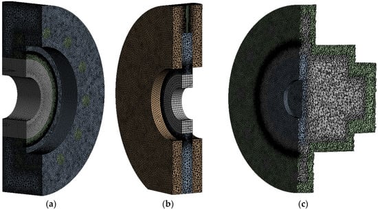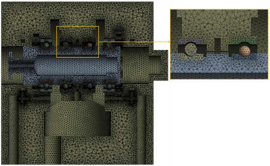 For the entire bearing chamber–bearing system, the global mesh element size is set to 3 mm. However, the mesh element size for the bearings within the system is refined to 1.5 mm to capture the finer details of these critical components. As a result, the mesh of the overall bearing chamber–bearing system consists of 2,308,616 cells, with an average mesh quality of 0.836. The maximum mesh quality is 1 and the minimum mesh quality is 0.00396. In order to avoid computational failure due to poor transition between the bearing mesh and the housing mesh, the mesh size of each bearing is set to 1.5 mm, and the mesh behavior is set to soft—the cell size will be affected by the overall cell size to avoid the case of uneven mesh transition between different regions. This mesh quality is deemed sufficient to meet the calculation requirements. The discrete representation of the bearing chamber–bearing system is illustrated in Figure 5.