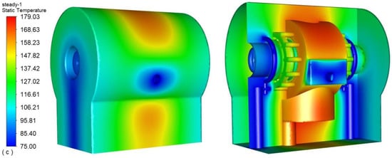 According to Formula (11), the convection heat transfer coefficient within ball bearings under Operating Conditions 1, 2, and 3 is 4970 W/(m2·K). The temperature of the bearing inner wall is set to the oil supply temperature of 75 °C.