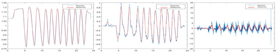 From left to right: barbell position, velocity and acceleration of one selected sample. Red lines: raw data. Blue lines: smoothed data.