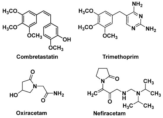 Among the abundance of biologically effective organic compounds, the 3,4,5-trimethoxyphenyl (TMP) scaffold is the structural pharmacophore of many biologically active substances with diverse bioactivities (Figure 1). This moiety is widely studied and clearly visible in the molecular structures of various scientific works and exhibits remarkable multifunctionality or specific targeting, surpassing the effectiveness of other derivatives at similar concentrations [16,17,18,19,20,21]. For example, combretastatin inhibits cell growth at nanomolar concentrations, exhibiting inhibitory effects even on multidrug-resistant cancer cell lines [22]. Trimethoprim is typically utilized to hinder the activities of dihydrofolate reductase (DHFR) and dihydropteroate synthase (DHPS) enzymes, respectively [23]. Oxiracetam constitutes a separate group of therapeutics due to its unique selectivity for brain areas involved in the procedures of acquiring knowledge and memory processes and its safe profile (Figure 1) [24]. These features make them suitable for chronic therapy in aged patients [25].