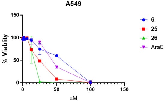 The selected compounds 6, 25, and 26 demonstrate promising dose-dependent anticancer activity in the A549 human lung carcinoma cell line. The cells were exposed to increasing concentrations of compounds or cytarabine (AraC) for 24 h, and post-treatment viability was measured using an MTT assay. The data are shown as mean ± SD of three experimental replicas.