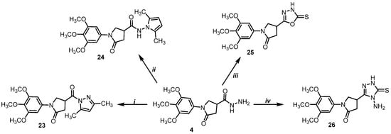 To generate 3,5-dimethylpyrazole 23, condensation was carried out using 1.6 equiv. of pentane-2,4-dione in propan-2-ol at reflux for 3 h. To generate compound 24, having a 2,5-dimethylpyrrole cycle, hydrazide 4 was reacted with two equiv. of hexane-2,5-dione and the reaction was catalyzed by glacial acetic acid.