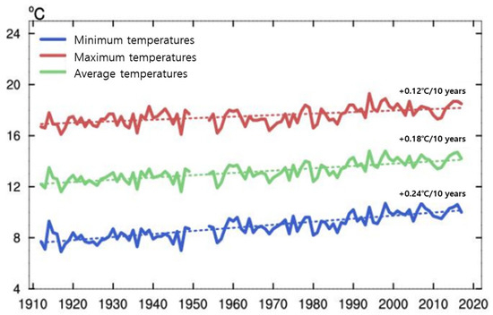 - National Institute of Meteorological Science. 100 Years Climate Change of the Korean Peninsula; National Institute of Meteorological Science: Jeju, Republic of Korea, 2018.