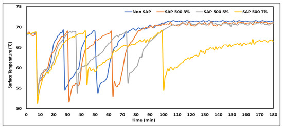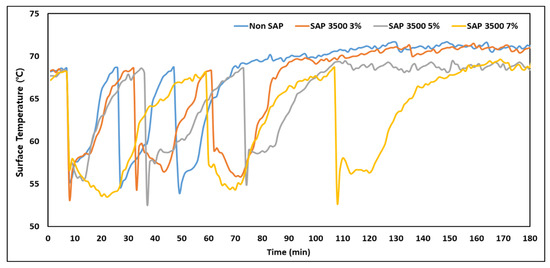 - In the case of a high content of the SAP (7% or higher), the surface temperature lowered after spraying was maintained or tended to rise after lowering. This thermal behavior is generally the same as the temperature change behavior of the porous asphalt surface, which has the effect of improving the temperature recovery delay effect similar to that of the SAP asphalt mixture with a high content of 7% or more.