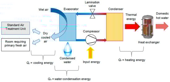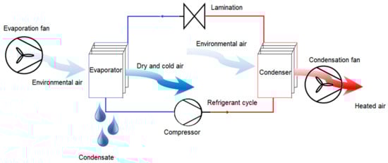The working cycle is represented in Figure 1 and can be described as follows. A flux of environmental air is blown through a heat exchanger, the evaporator, by a fan. In this coil, part of the air thermal energy transfers to a refrigerant flux, which is evaporating well below the dew point temperature of environmental air. In such a way, the environmental air flux is cooled below its dew point, causing the condensation of part of its vapour content. The heat is discharged into the environment through a second coil, the condenser. Here, the refrigerant, compressed by the compressor to a temperature above that of the environment, condenses, exchanging heat with a second environmental air flux, which is moved by a second fan. Finally, a lamination valve (expansion valve) returns the refrigerant to the initial conditions of the cycle.
